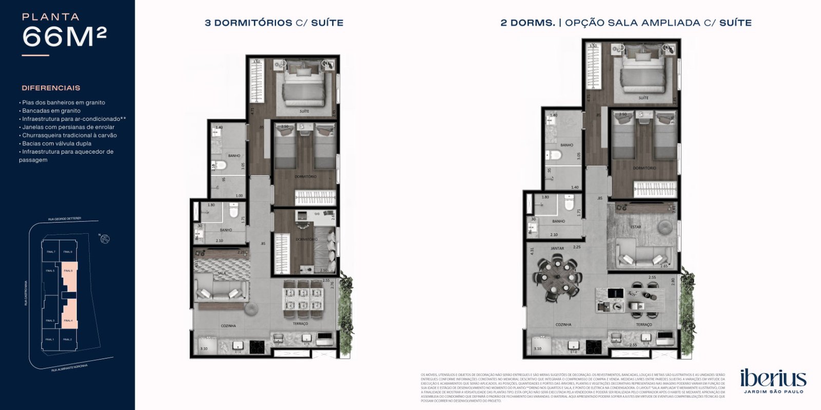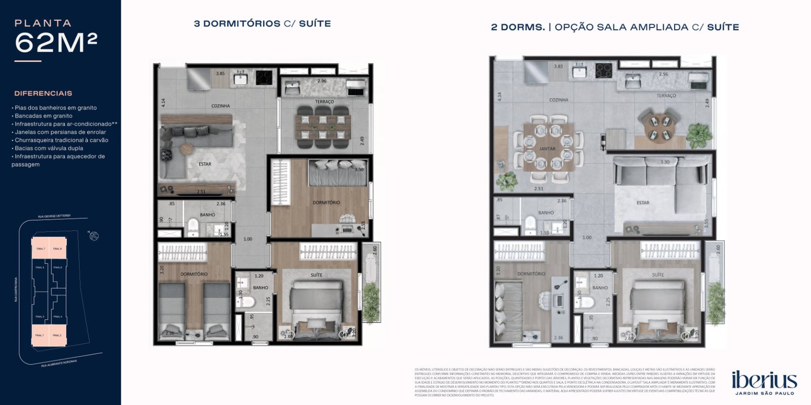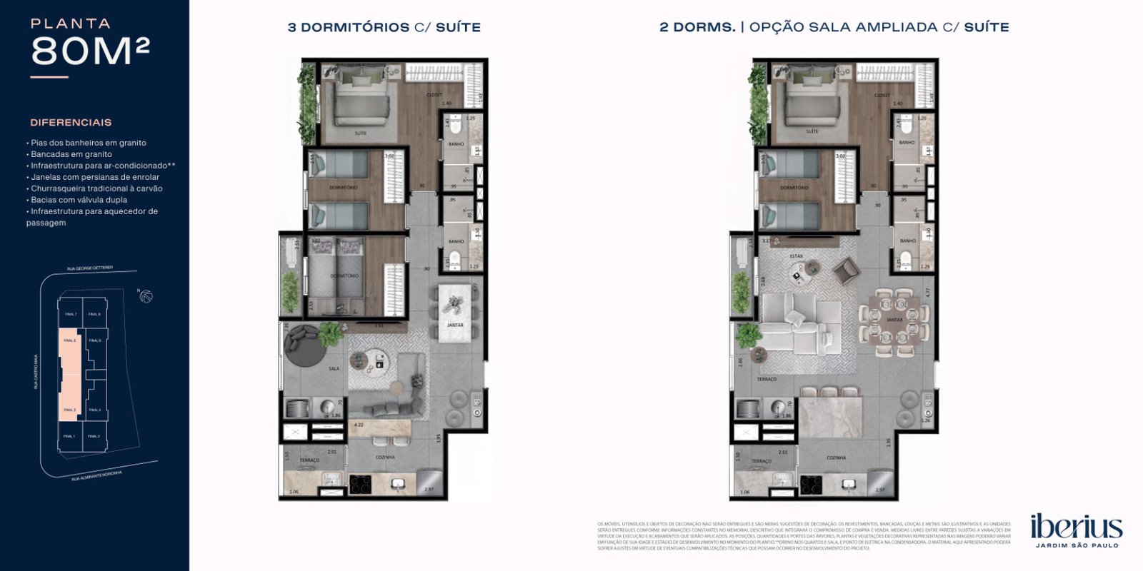 As plantas do Iberius foram projetadas para oferecer amplitude, iluminação natural e integração entre os ambientes. Com opções de 62 a 80 m², os apartamentos apresentam 3 dormitórios, suítes espaçosas e varandas amplas conectadas ao living, valorizando conforto e sofisticação.